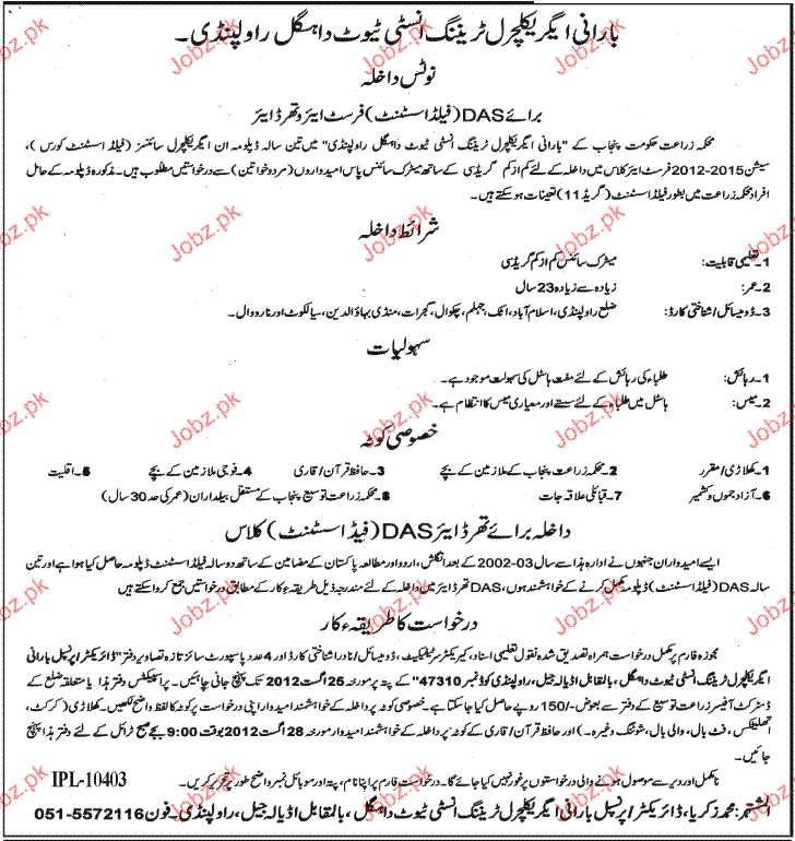 Admission in DAS Field Assistant in Barani Agriculture Training Institute in Rawalpindi Read newspaper ad for exact details.