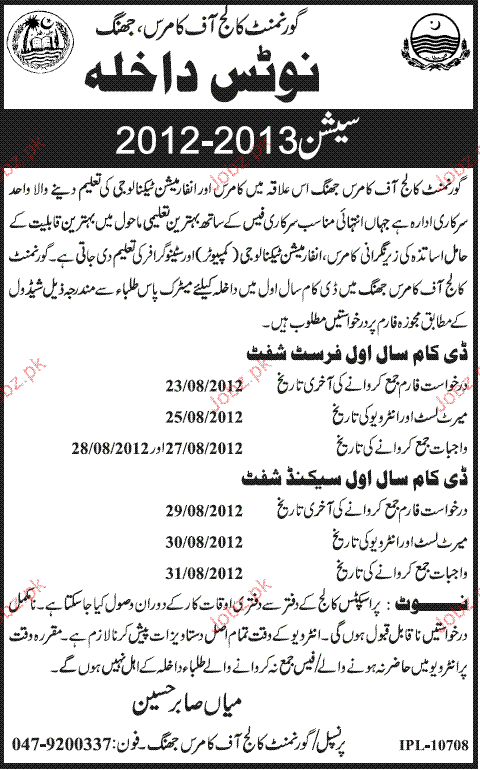 Admission in D.Com in Government College of Commerce in Jhang Read newspaper ad for exact details.