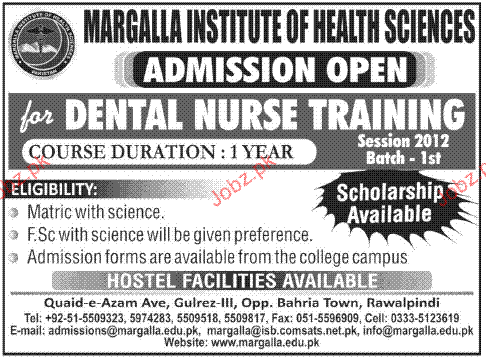 Admission in Dental Nurse Training in Margalla Institute of Health Sciences in Rawalpindi Read newspaper ad for exact details.