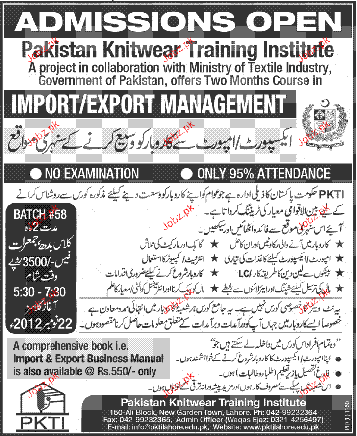 Admission in Import / Export Management in Pakistan Knitwear Training Institute in Lahore Read newspaper ad for exact details.
