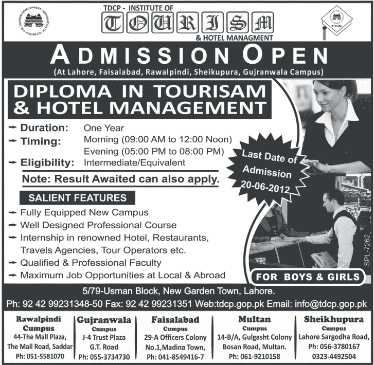 Admission in Diploma in Tourism and Hotel Management in TDCP Institute of Tourism & Hotel Management in Rawalpindi Read newspaper ad for exact details.