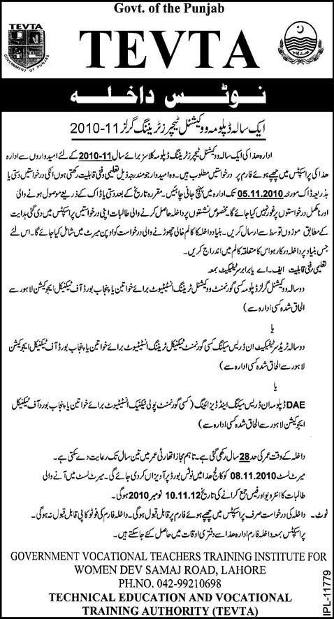 Admission in Diploma Vocational Teacher Training in TEVTA Institute in Lahore Read newspaper ad for exact details.