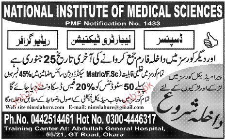 Admission in Dispenser, Lab Technicians and Radiographers in National Institute of Medical Sciences in Okara Read newspaper ad for exact details.