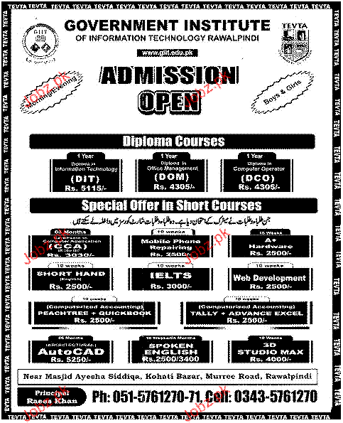 Admission in DIT, DOM, DCO, IELTS and Web Development in Government Institute in Rawalpindi Read newspaper ad for exact details.