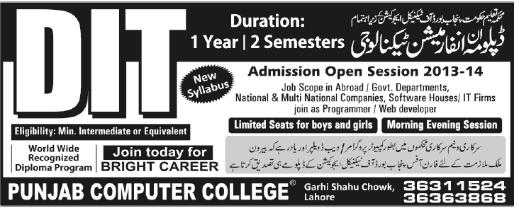 Admission in DIT in Punjab Computer College in Lahore Read newspaper ad for exact details.