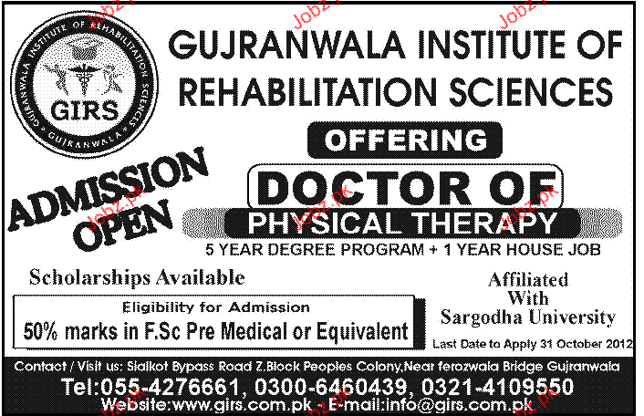 Admission in Doctor of Physical Therapy in Gujranwala Institute of Rehabiliation Sciences in Karachi Read newspaper ad for exact details.