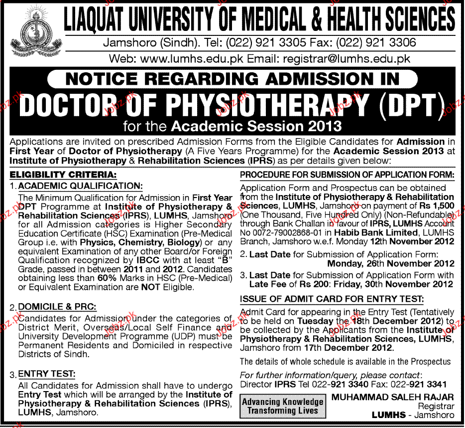 Admission in Doctor of Physiotherapy in Liaquat university of Medical & Health Sciences in Jamshoro Read newspaper ad for exact details.