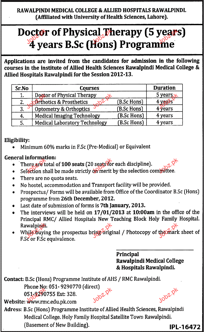 Admission in DPT and BSc Hons in Rawalpindi Medical College & Allied Hospital in Rawalpindi Read newspaper ad for exact details.
