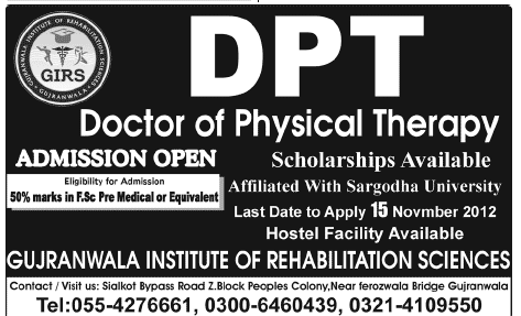Admission in Doctor of Physical Therapy in Gujranwala Institute of Rehabilitation Sciences in Gujranwala Read newspaper ad for exact details.