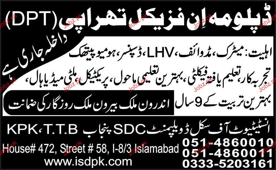 Admission in Diploma in Physical Therapy in Institute of Skill Development Punjab in Islamabd Read newspaper ad for exact details.