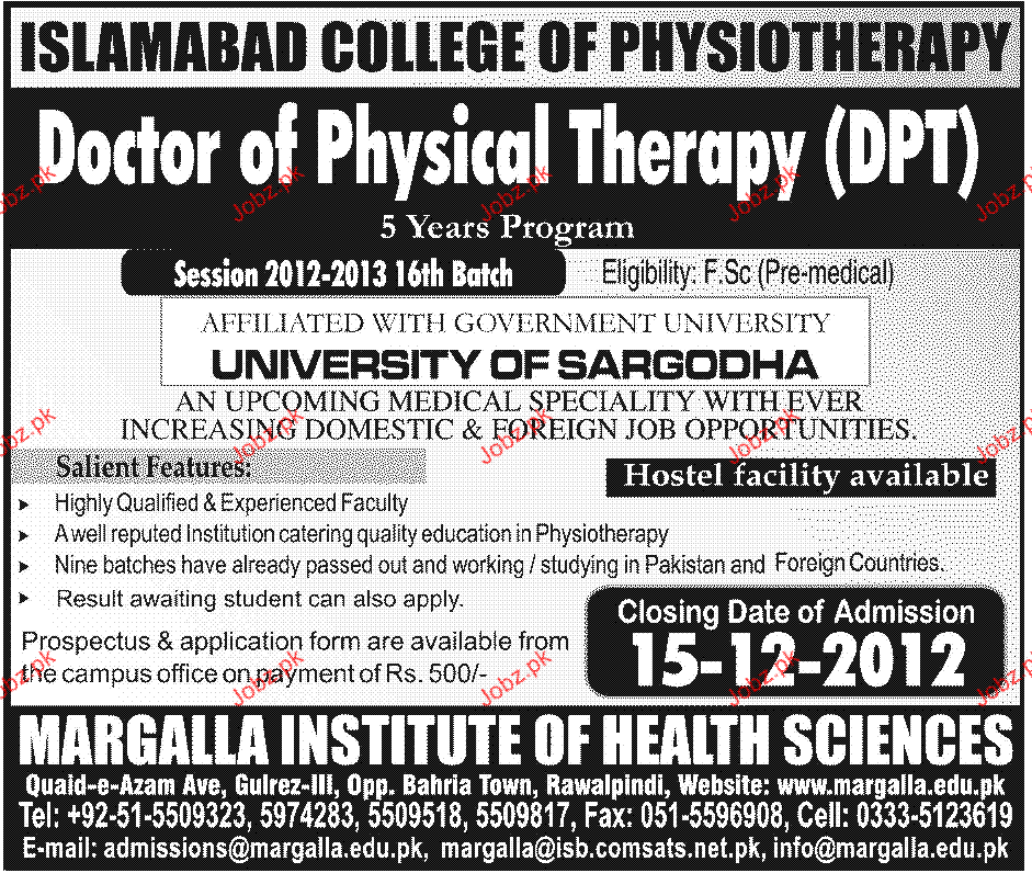 Admission in Doctor of Physical Therapy in Margalla Institute of Health Sciences in Islamabad Read newspaper ad for exact details.
