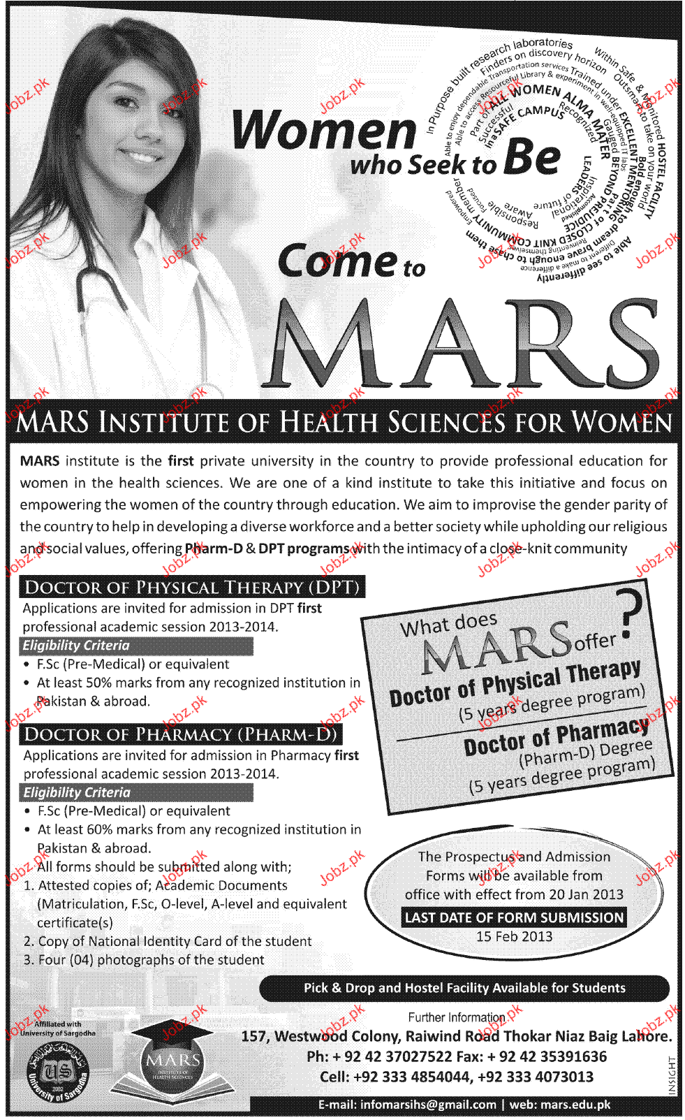 Admission in Doctor of Physical Therapy in Mars Institute of Health Science For Women in Lahore Read newspaper ad for exact details.