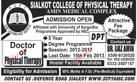 Admission in Doctor of Physical Therapy in Sialkot College of Physical Therapy in Sialkot Read newspaper ad for exact details.