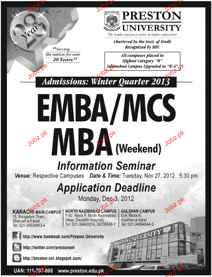Admission in EMBA / MCS and MBA in Preston University in Karachi Read newspaper ad for exact details.