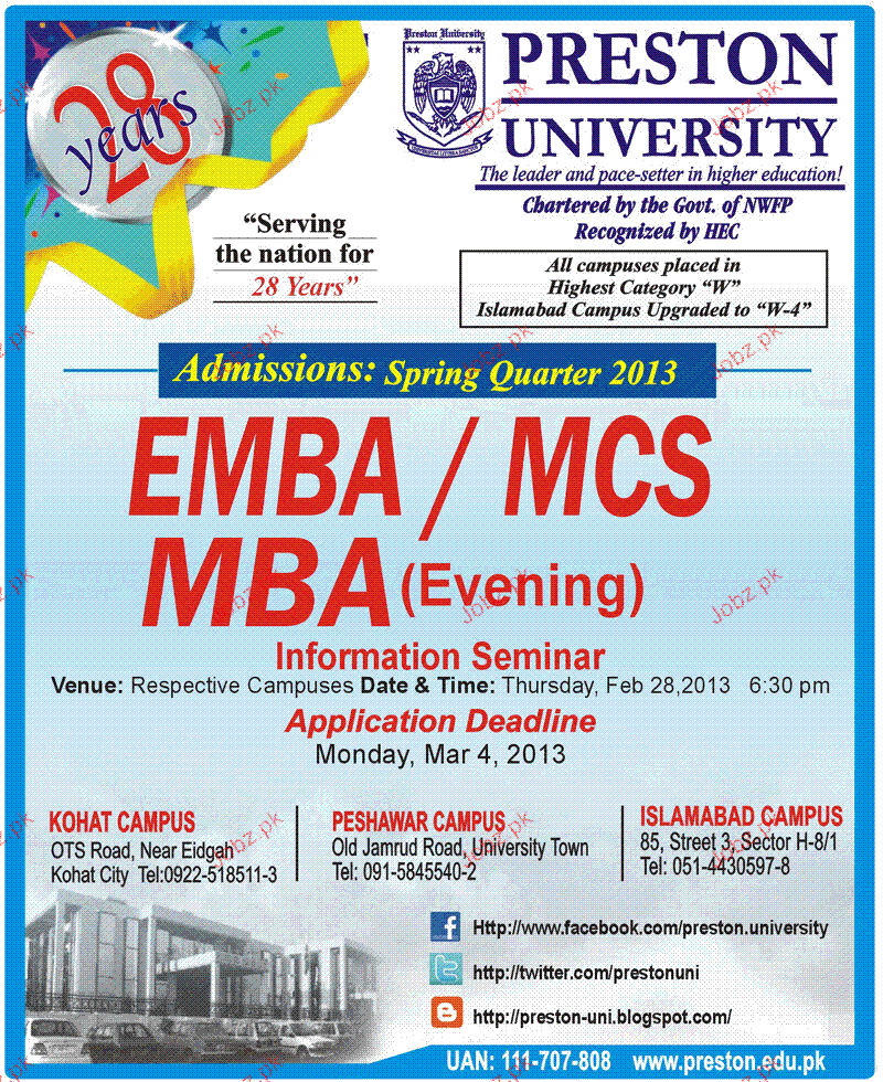 Admission in EMBA / MCs and MBA in Preston University in Islamabad Read newspaper ad for exact details.