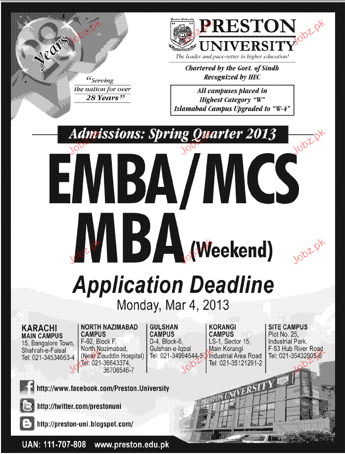 Admission in EMBA / MCs and MBA in Preston University in Karachi Read newspaper ad for exact details.