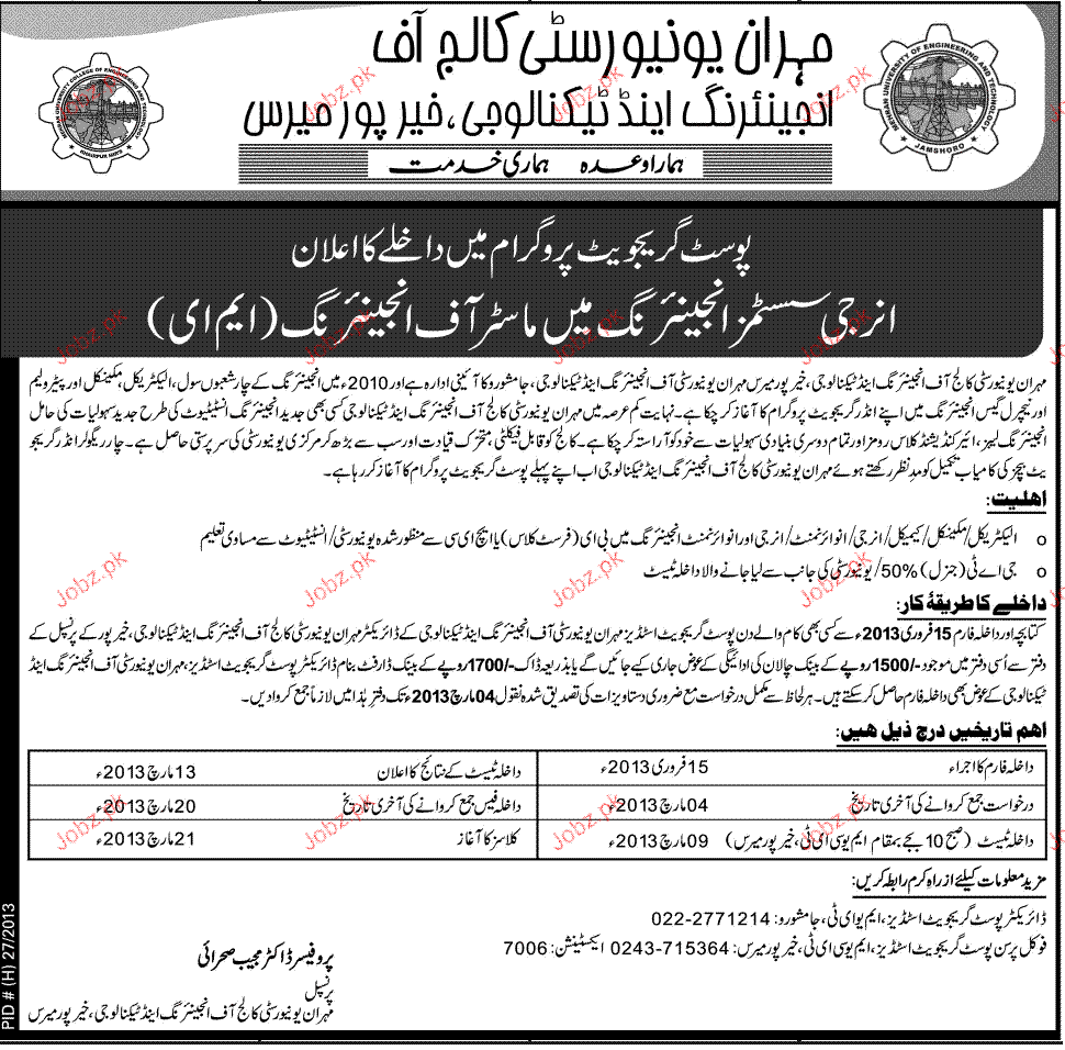 Admission in Engineering in Mehran University of Engineering and Technology in Khairpur Read newspaper ad for exact details.