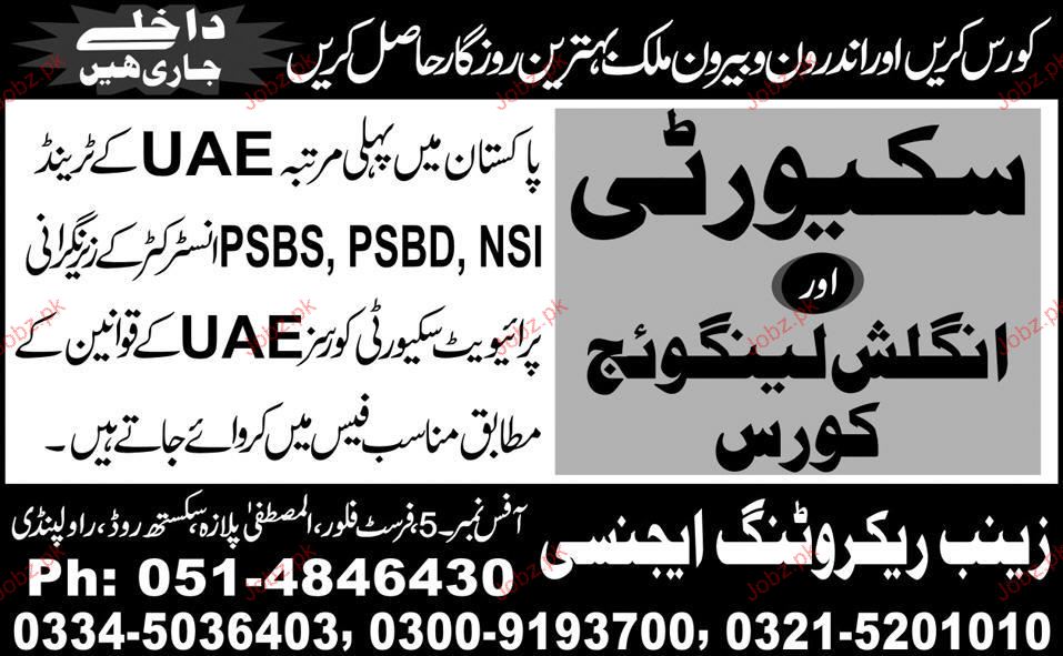 Admission in English Language Course and Security in Zanib Recruiting Agency in Rawalpindi Read newspaper ad for exact details.