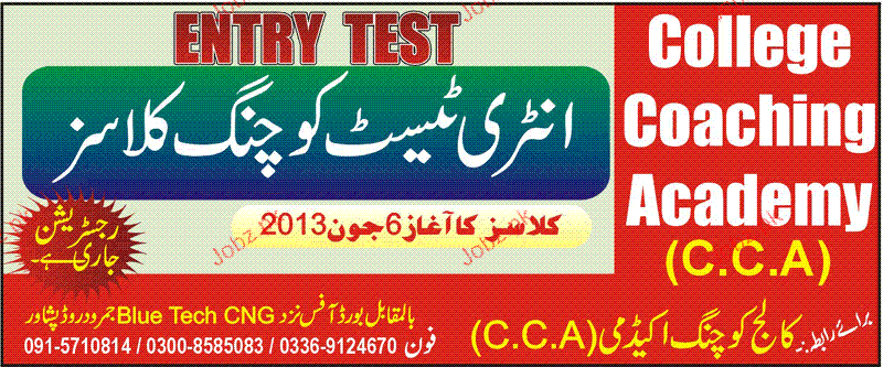 Admission in Entry Coaching Classes in College Coaching Academy in Peshawar Read newspaper ad for exact details.