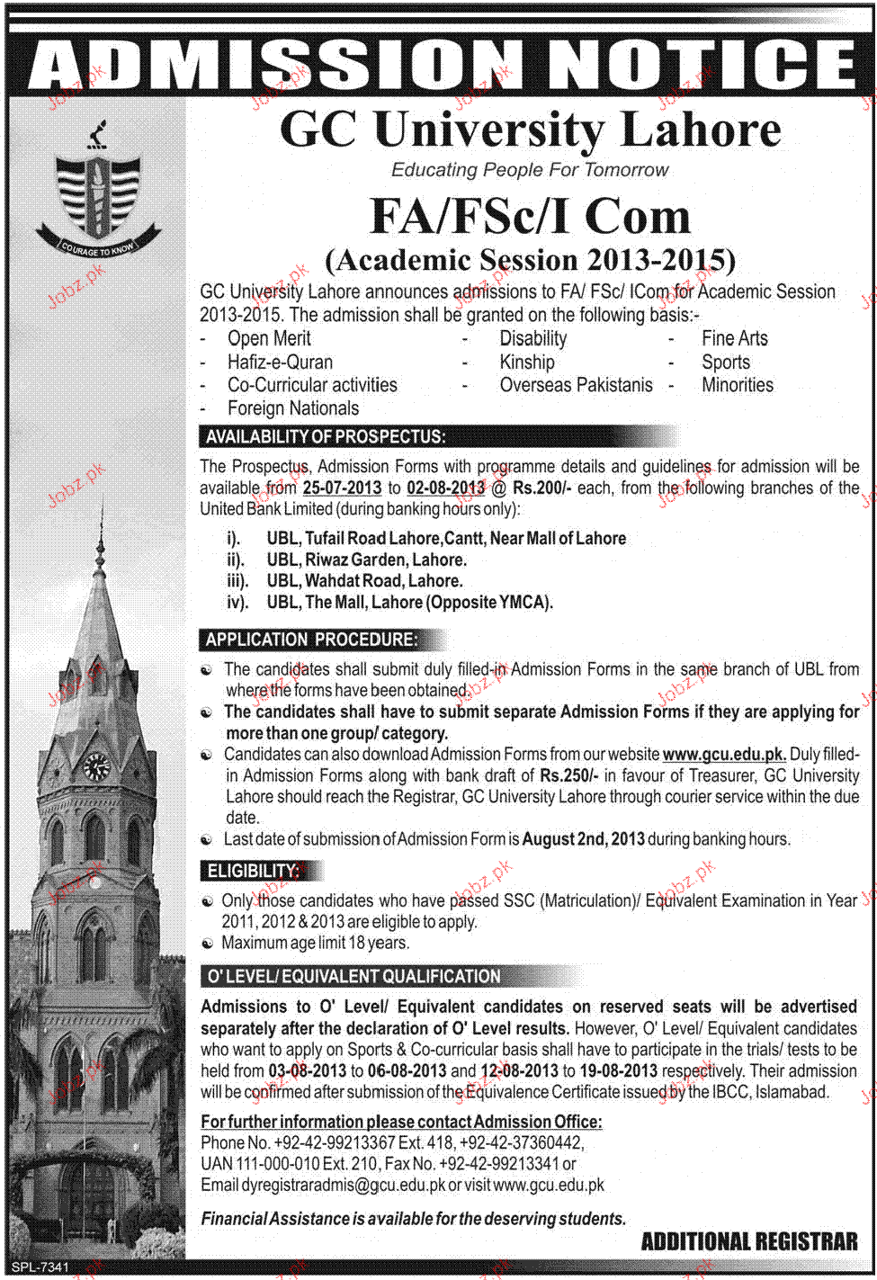 Admission in FA, FSC and I.Com in GC University in Lahore Read newspaper ad for exact details.