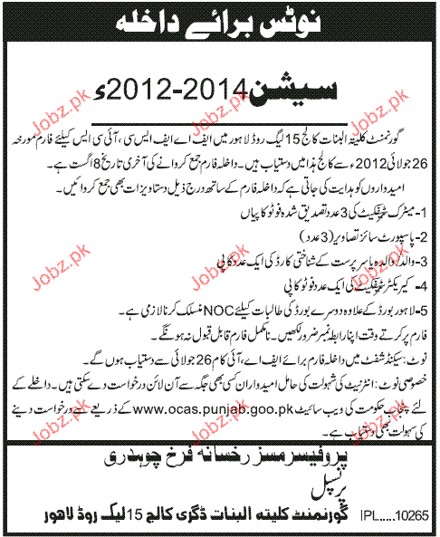Admission in FA, FSC and ICS in Govt Kulatia Al Bannat College in Lahore Read newspaper ad for exact details.