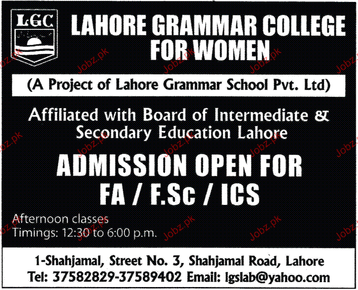 Admission in FA, FSC and ICS in Lahore Grammar College For Women in Lahore Read newspaper ad for exact details.