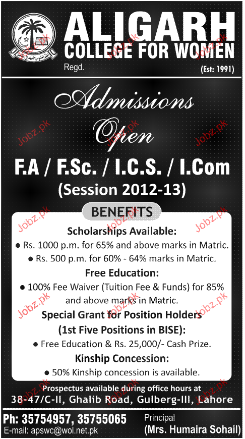 Admission in FA, FSc, ICS and ICaom in Aligrah College For Women in Lahore Read newspaper ad for exact details.