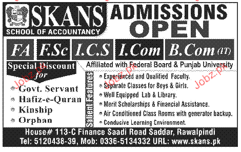 Admission in FA, Fsc, ICS, I.Coma nd B.Com in Skans School of Accountancy in Rawalpindi Read newspaper ad for exact details.