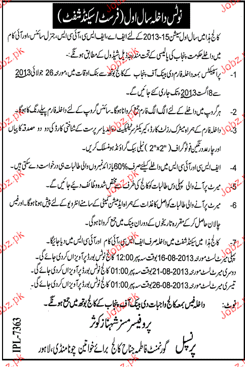 Admission in FA/Fsc, ICS and Gen Sci in Government Fatima Jinnah College For Women in Lahore Read newspaper ad for exact details.