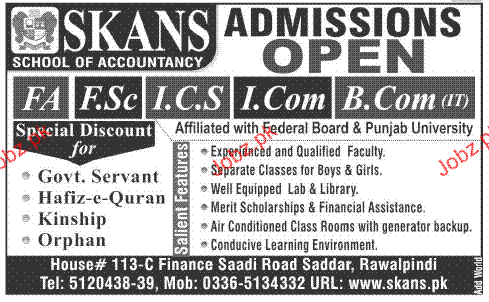 Admission in FA,Fsc, ICS, I.Com and B.Com in SKANS School of Accountancy in Rawalpindi Read newspaper ad for exact details.