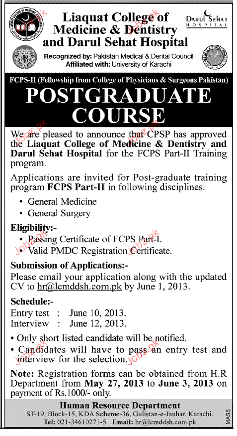 Admission in FCPS Part-II in Liaquat College of Medicine & Dentistry in Karachi Read newspaper ad for exact details.