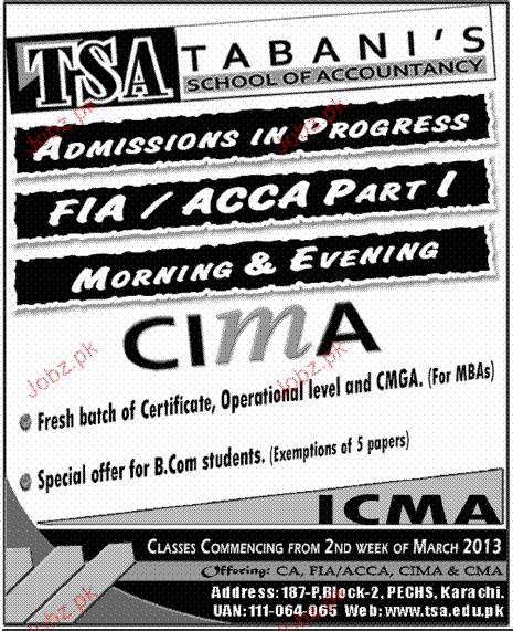 Admission in FIA, ACCA, CIMA and CMA in Tabanis's School Accountancy in Karachi Read newspaper ad for exact details.