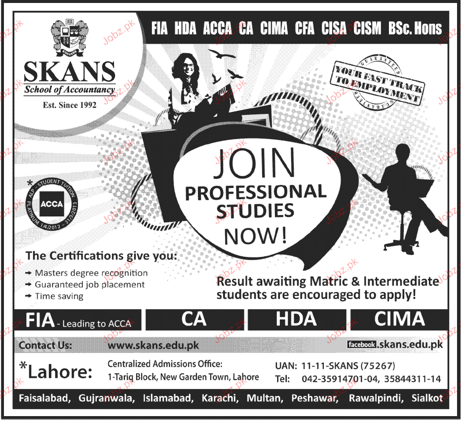 Admission in FIA, CIMA, HDA and CA in Skans School of Accountancy in Lahore Read newspaper ad for exact details.