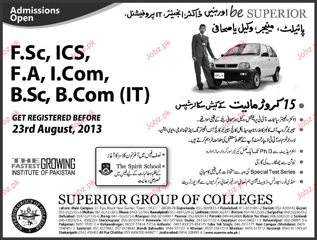 Admission in F.Sc, ICs, FA, I.Com and BSc in Superior Group of Colleges in Rawalpindi Read newspaper ad for exact details.