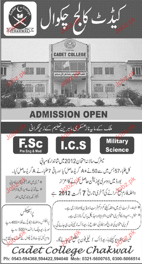 Admission in FSC Pre Medical, Pre Engineering, Military Sciences & ICS in Cadet College Chakwal in Chakwal Read newspaper ad for exact details.