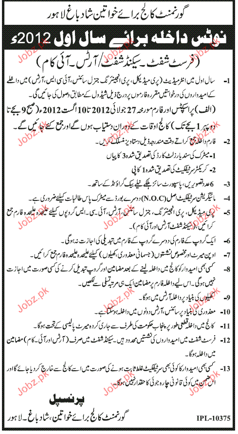 Admission in FSC Pre Medical, Pre Engg, General Science, FA & ICS in Govt College For Women Shad Bagh in Lahore Read newspaper ad for exact details.