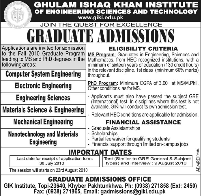 Admission in Graduate Ghulam Ishaq Khan Institute,Punjab Read newspaper ad for exact details.