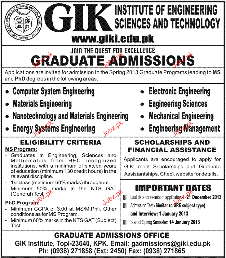 Admission in Graduate in GIK Institute of Engineering Sciences and Technology in Swabi Read newspaper ad for exact details.