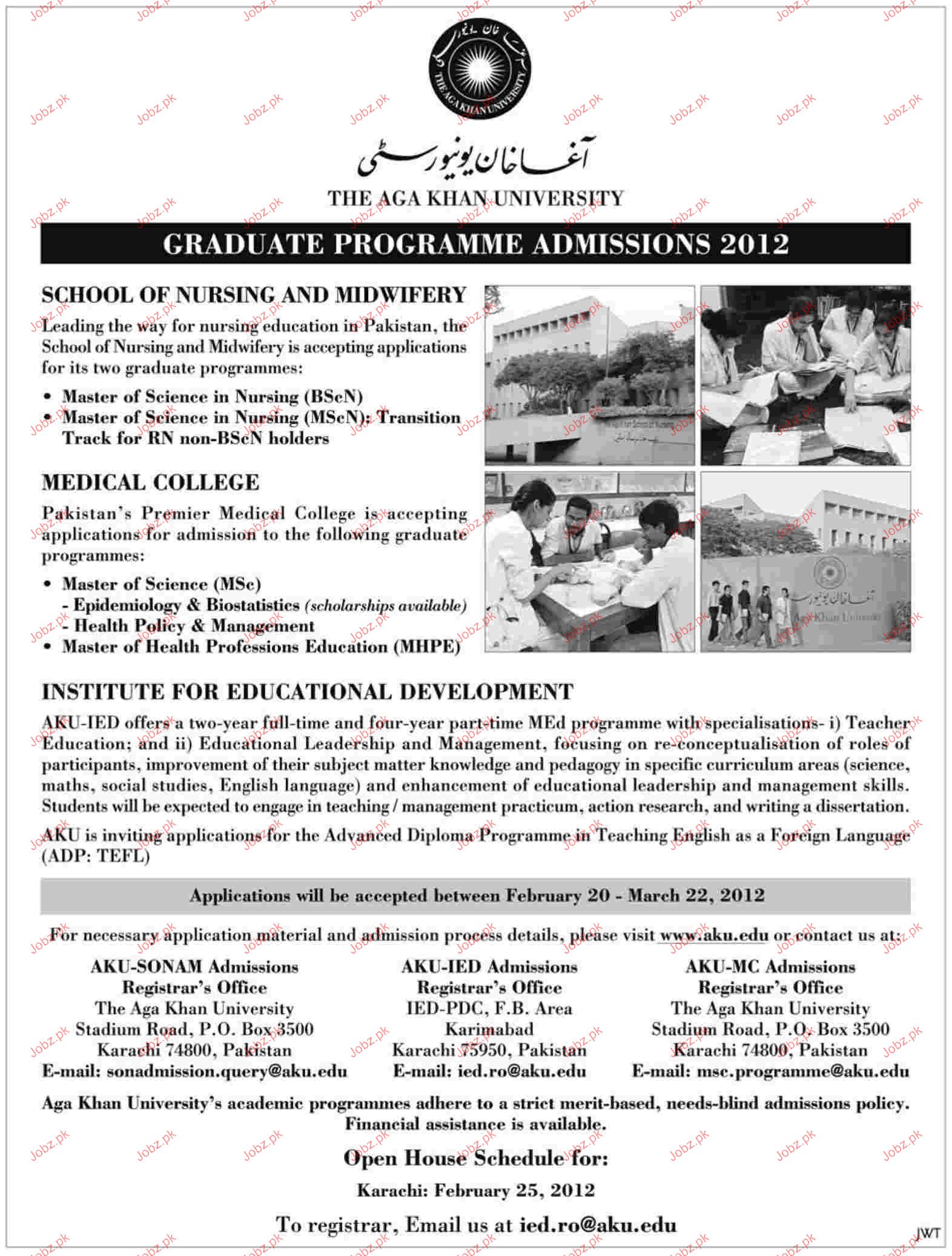 Admission in Graduate Program in The Aga Khan University in Karachi Read newspaper ad for exact details.