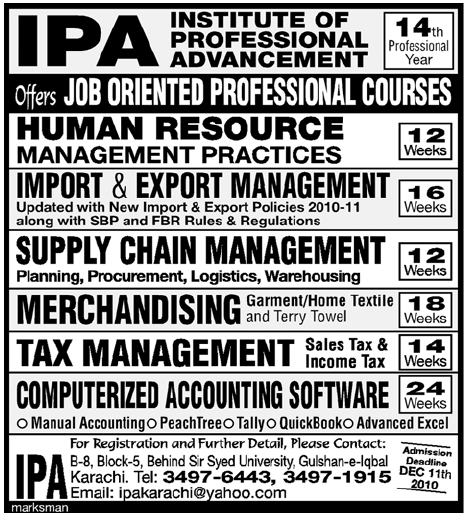 Admission in HR, Chain Management, Merchandising, in IPA Institute Of Professional Advancement Karachi Read newspaper ad for exact details.