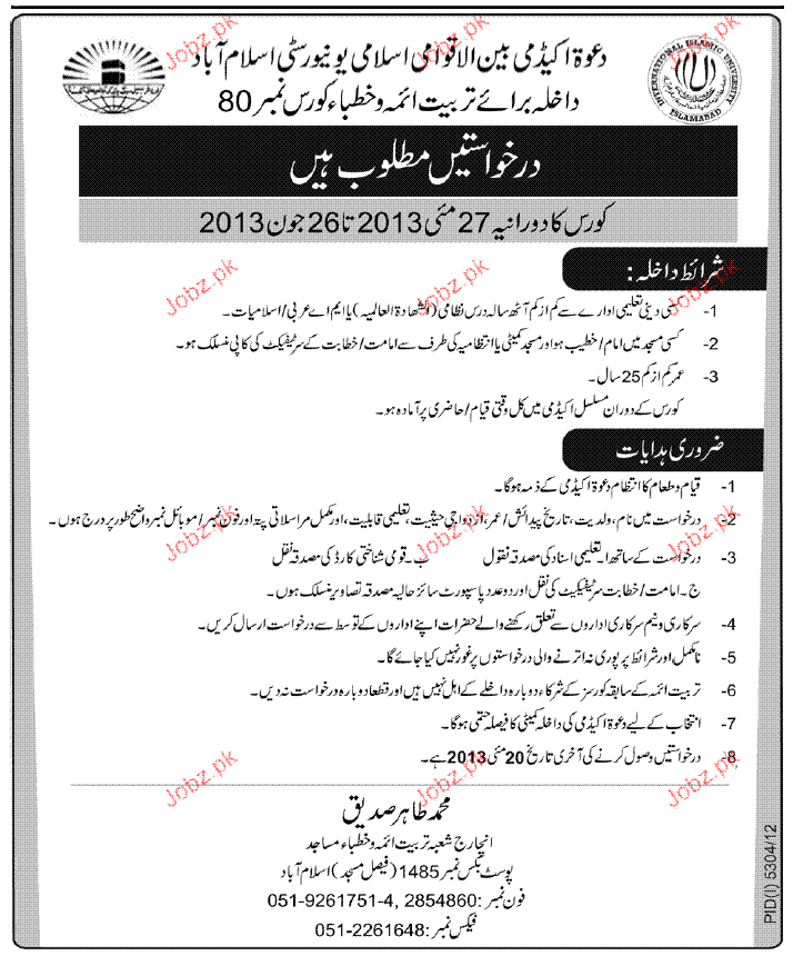 Admission in Iamma and Khutba Course in Dawat Academy International Islamic University in Islamabad Read newspaper ad for exact details.
