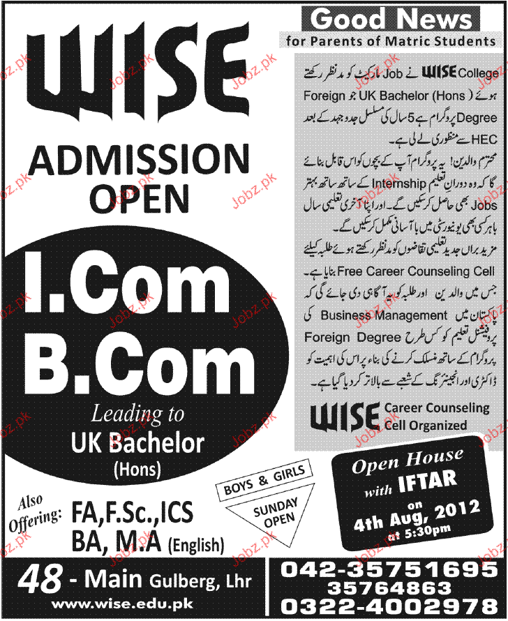 Admission in I.Com, B.com, FA, F.Sc, ICS, BA and MA English in Wise College in Lahore Read newspaper ad for exact details.