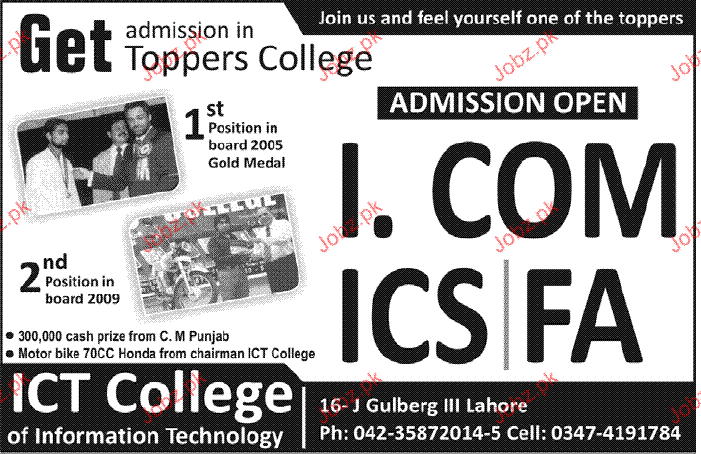Admission in I.Com, ICS and FA in Toppers College of Information Technology in Lahore Read newspaper ad for exact details.