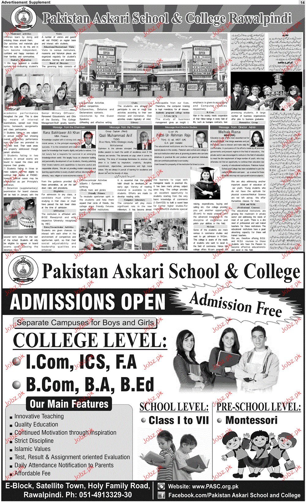 Admission in I.Com, ICs, FA, B.Com and BA in Pakistan Askari school and College in Rawalpindi Read newspaper ad for exact details.
