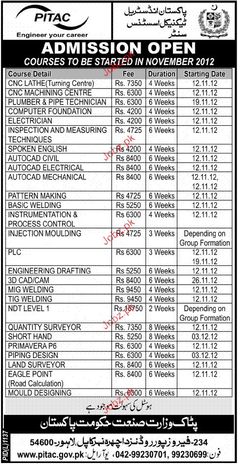 Admission in Industrial Courses in Pakistan Steel Technical Estate Center in Lahore Read newspaper ad for exact details.