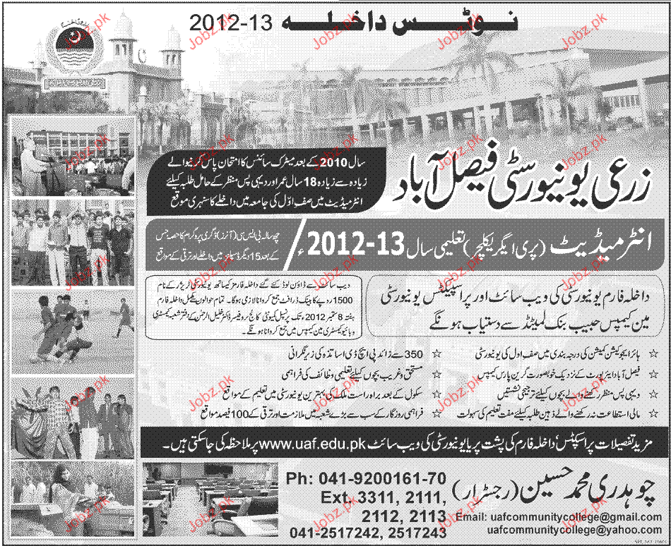Admission in Intermediate in Pre Agriculture in Agriculture University Faisalabad Read newspaper ad for exact details.