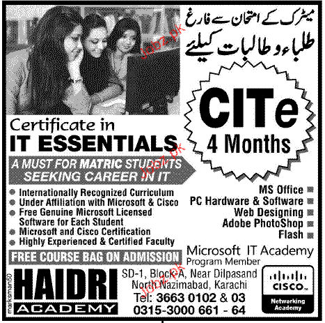 Admission in IT Professional Courses in Haidri Academy in Karachi Read newspaper ad for exact details.