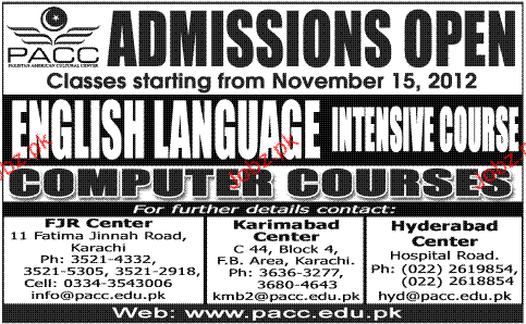 Admission in Language Course in Pakistan American Cultural Center in Karachi Read newspaper ad for exact details.