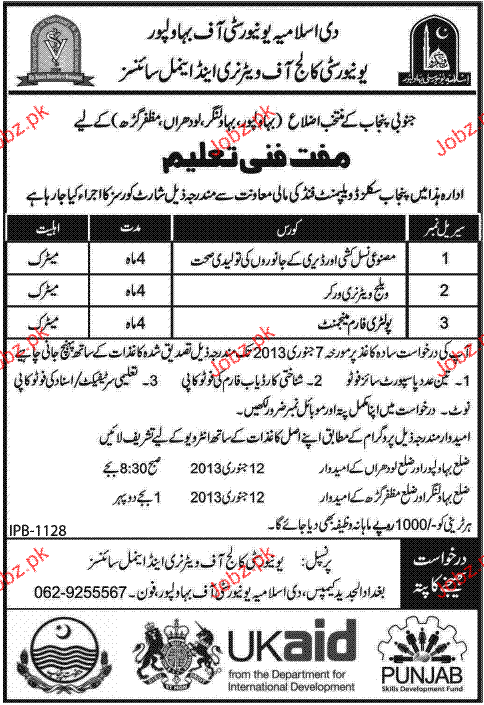 Admission in Livestock Courses in University College of Veterinary and Animal Sciences in Bahawalpur Read newspaper ad for exact details.