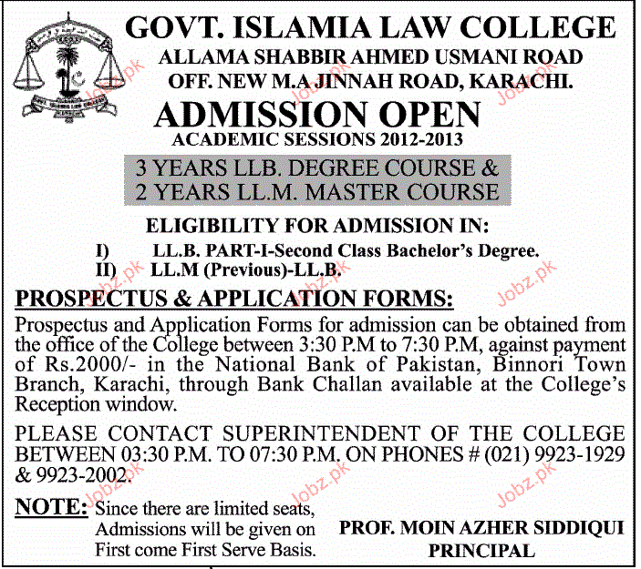 Admission in LLB and LLM in Govt Islamia Law College in Karachi Read newspaper ad for exact details.